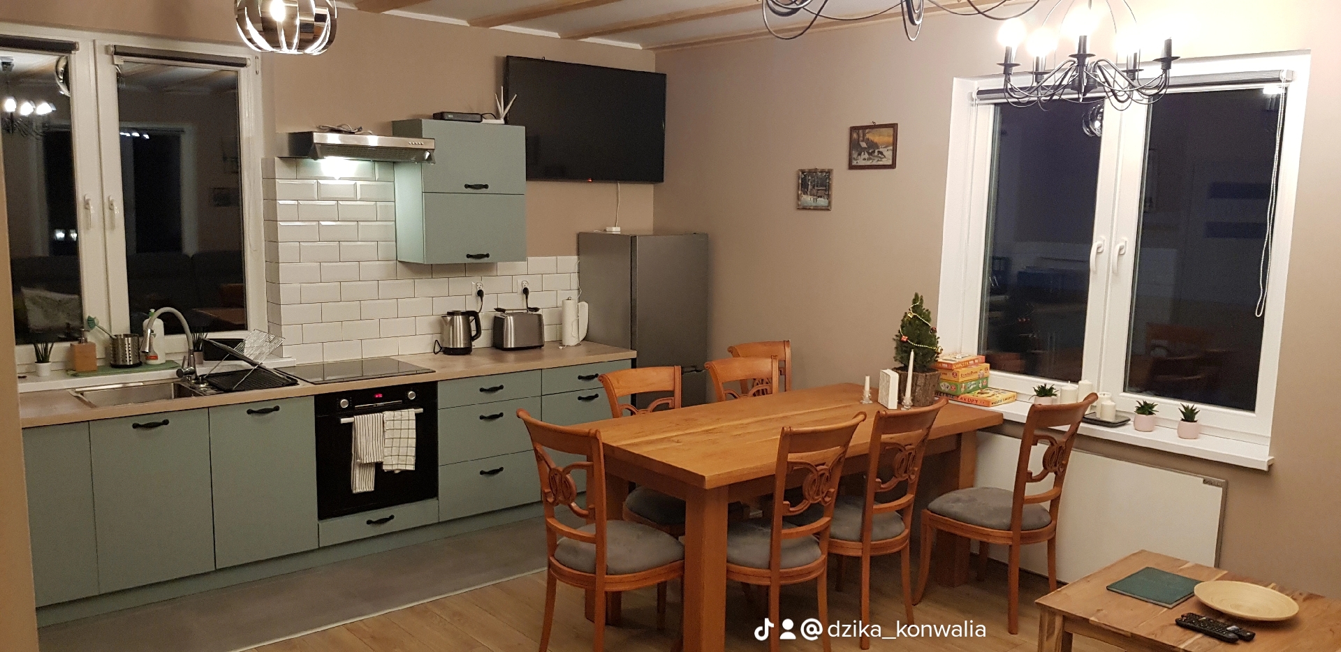 Wielki dębowy stół z 8-mioma krzesłami i szeroki narożnik z ławą oddaje pełny klimat i wygodę tego miejsca.