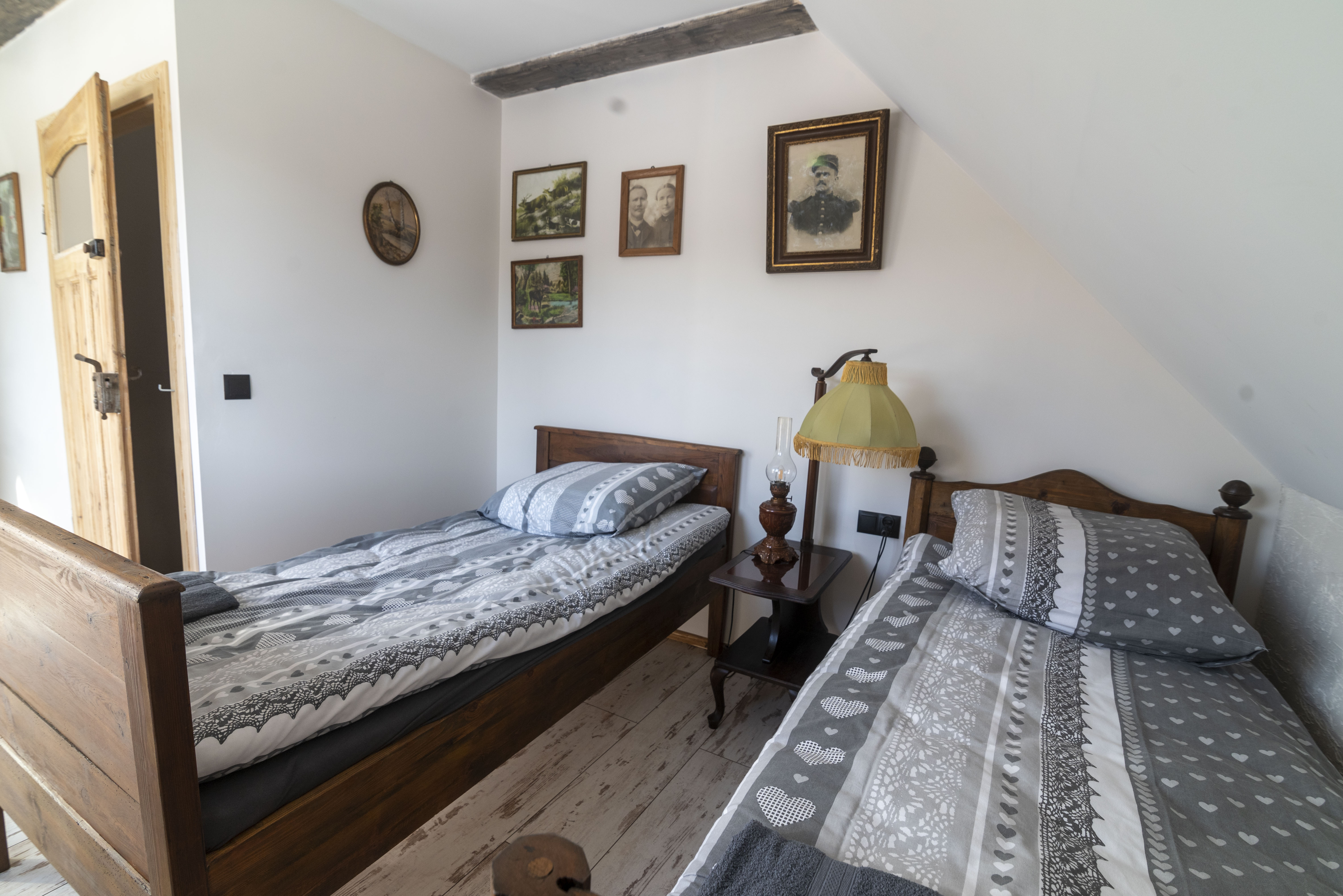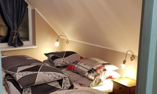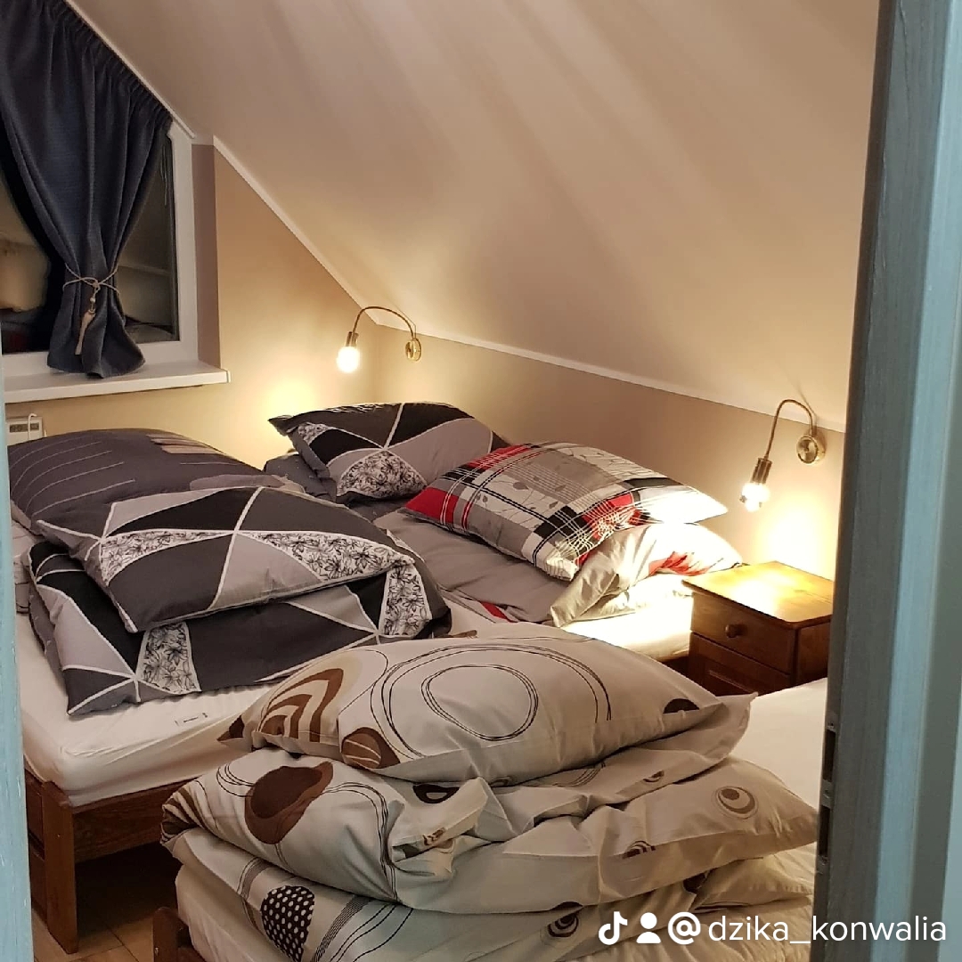 3 sypialnie z 9-mioma miejscami noclegowymi, oraz rozkładany komplet narożny na 2-osoby. Wszystkie łóżka posiadają wygodne materace i świeżą pościel, a także łóżeczko turystyczne dla niemowląt (bez pościeli).