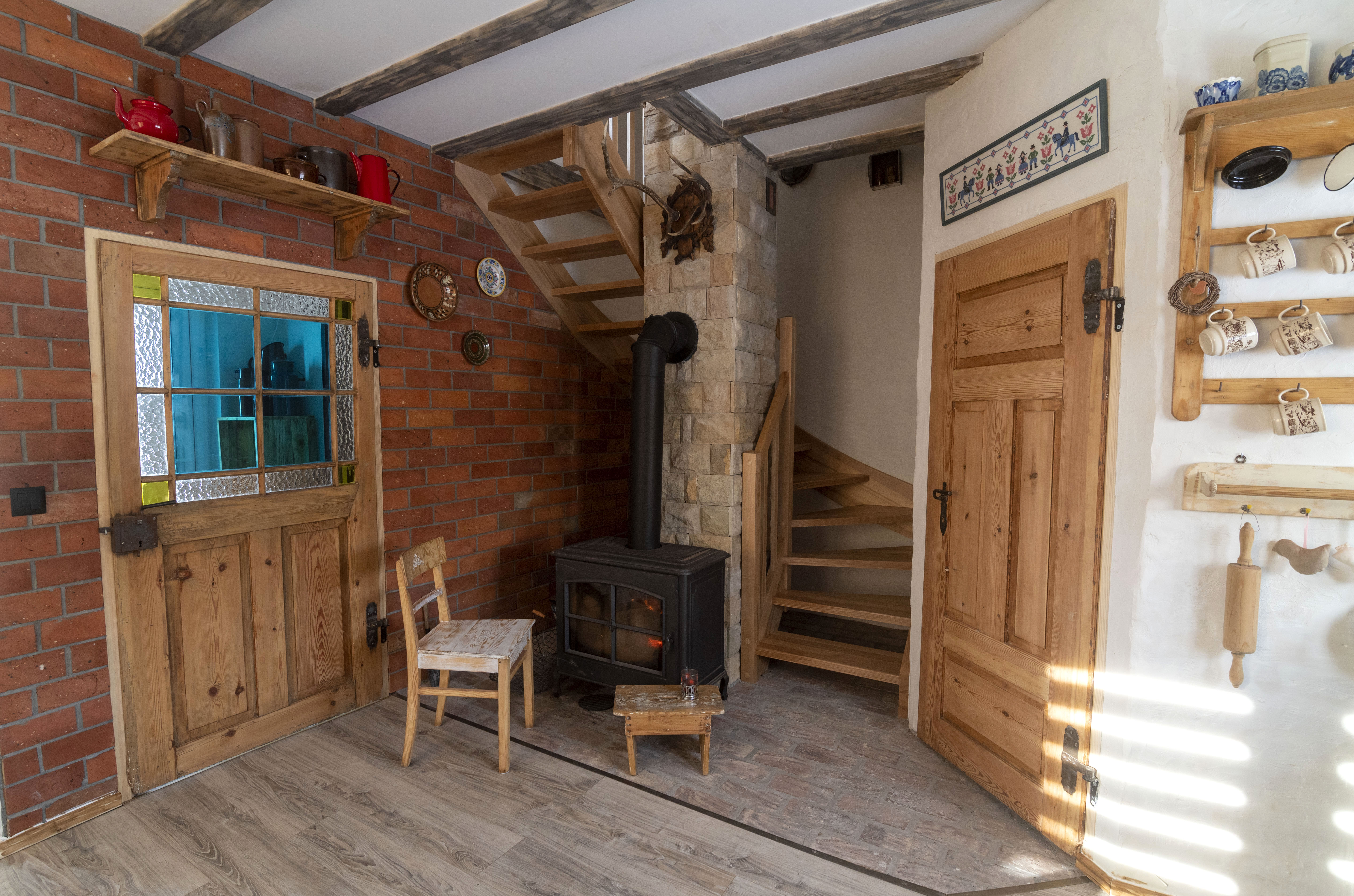 Salon połączony z kuchnią tworzy idealny klimat ogniska domowego, a mówiąc o ognisku umieszczony jest tam kominek opalany drewnem.
