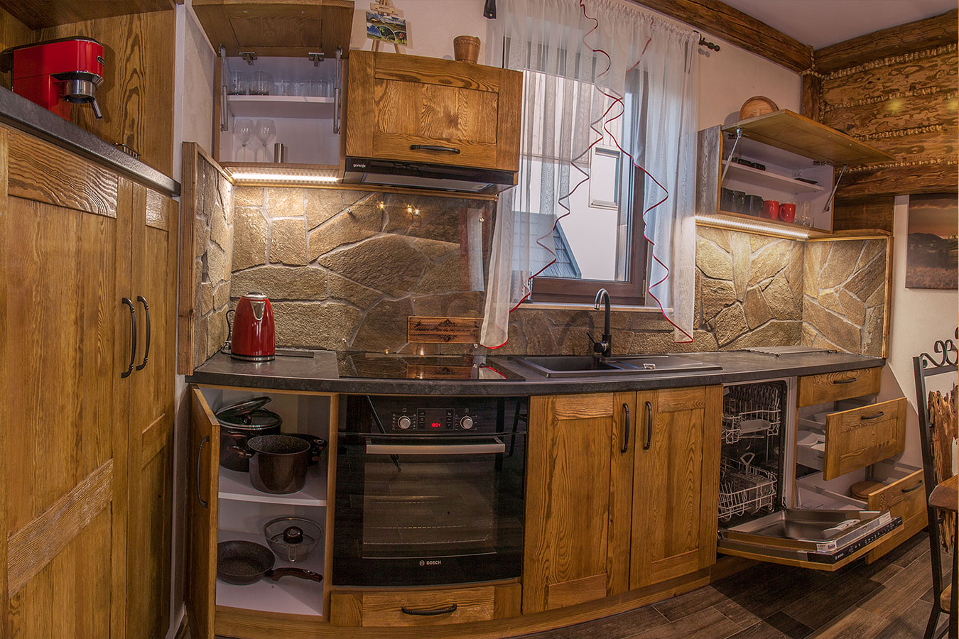 Kuchnia: W pełni wyposażony aneks (płyta indukcyjna, zmywarka, piekarnik, lodówka, ekspres do kawy).