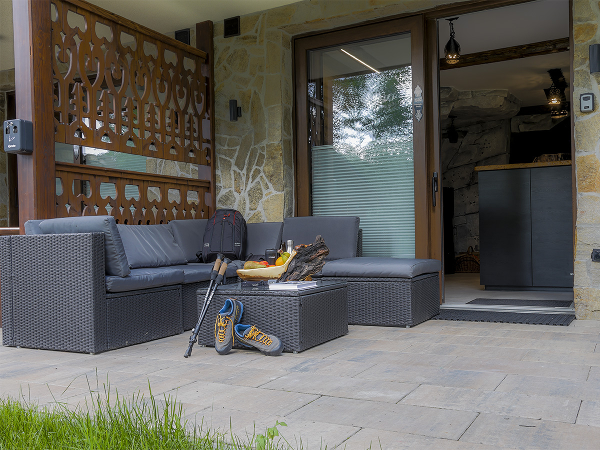 Relaks na zewnątrz: Prywatny taras położony zaledwie kilka kroków od grill chaty.