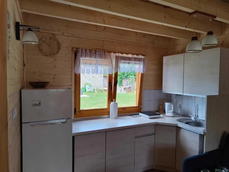 lodówkę z zamrażalnikiem, płytę indukcyjną, zlew, komplet garnków i patelni, czajnik, sztućce, talerze, kubki i szklanki.